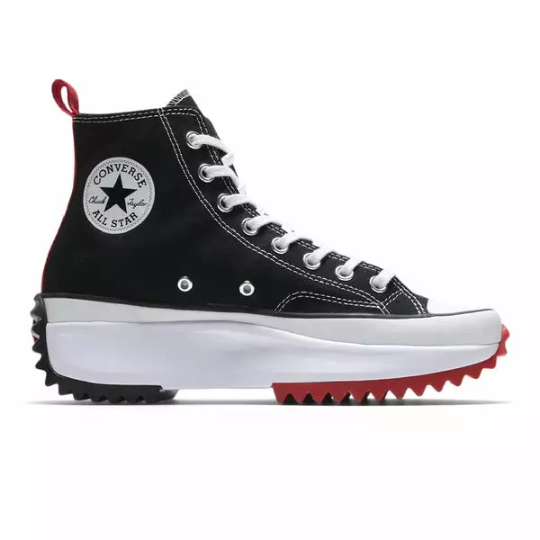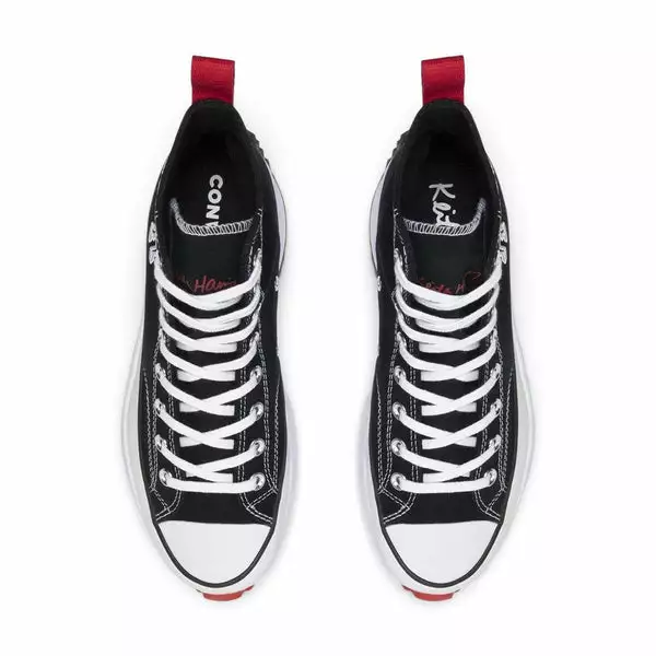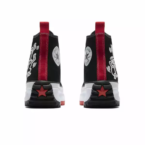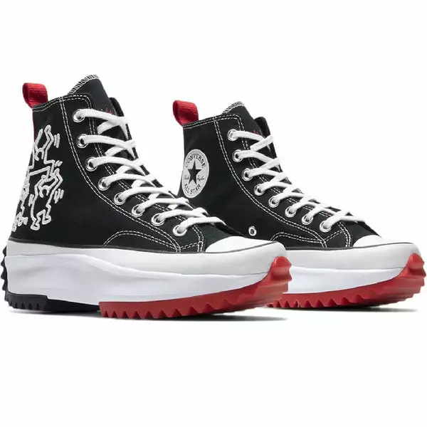 The vibrancy of Haring’s distinctive style is represented across the canvas upper of the fashion forward, ultra-modern Run Star Hike with embroidered graphics. A simple, classic black and white palette is bolstered with subtly applied yet bold red contrast accents.