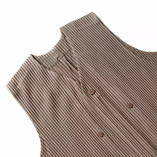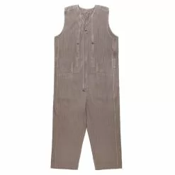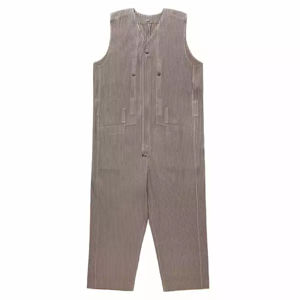 This sleeveless pleated jumpsuit has a loose fit and V-neckline with a zip-front and single button closure. It includes pockets on the chest and hips and belt loops at the waist.