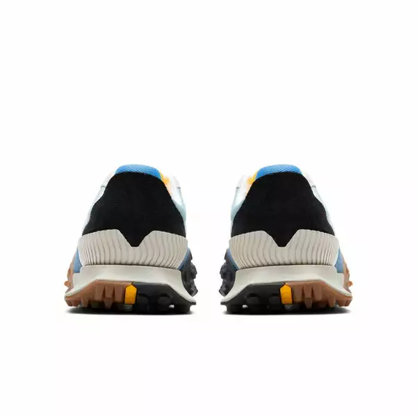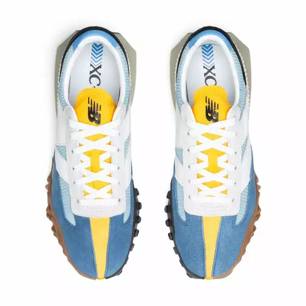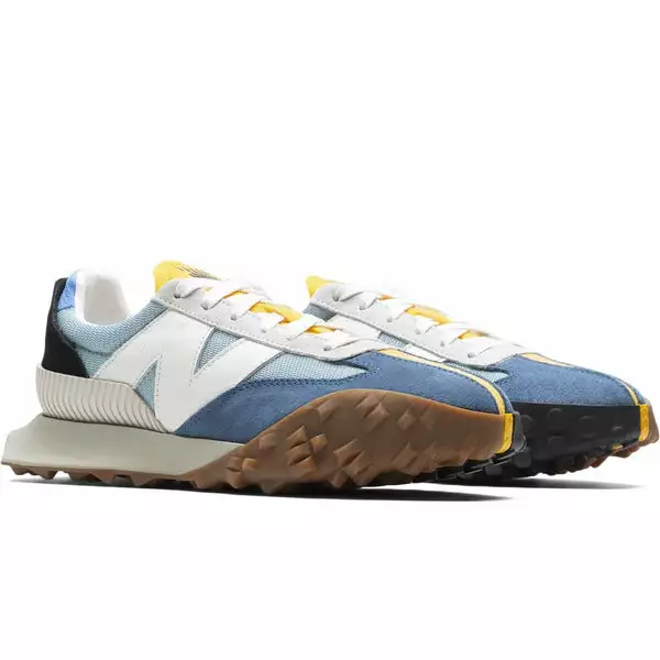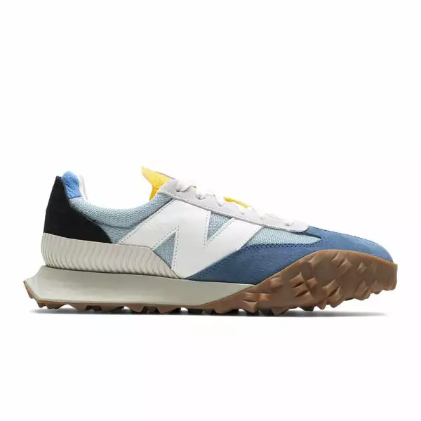 Based on a 1970s runner, the sporty design features a light blue mesh upper with royal blue suede overlays adding some texture. White leather “N” branding takes its usual spot on the side panels while a yellow tongue and black heel complete the colorway. The shoe’s focal points include an exaggerated tread which wraps around from the outsole to the toe box and an oversized midsole and outsole which extends past the heel.