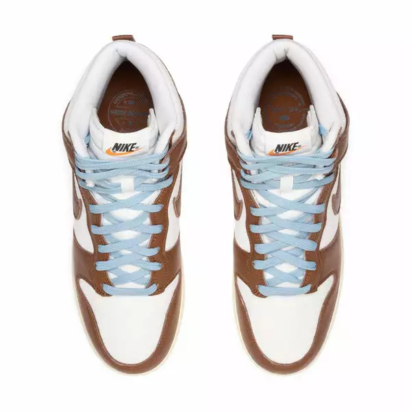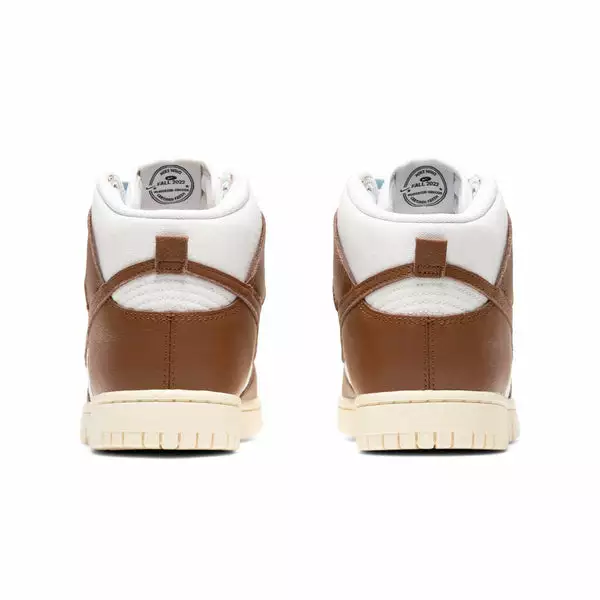 Nike dresses this high-top classic in a smooth leather base, sporting brown “Pecan” panels that hit the perforated toe boxes, quarters, and collar areas. White leather counteracts, making a distinctive mark that runs through the overlays. Swooshes extend onto the medials in the same warm hue, while blue laces are set atop the tongues fashioned with branded badges.